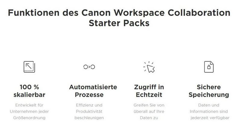 Das Canon Workspace Collaboration Starter Pack ist eine flexible, erweiterbare Lösung für Unternehmen jeder Größenordnung. Die Lösung aus dem Hause Canon passt sich Ihrer Unternehmensgröße an und kann jederzeit auf Ihre Anforderungen abgestimmt werden.