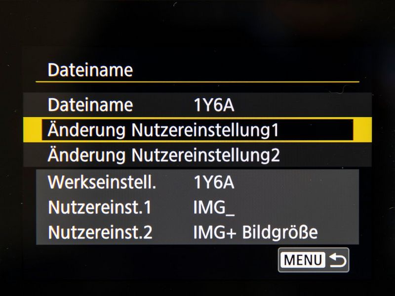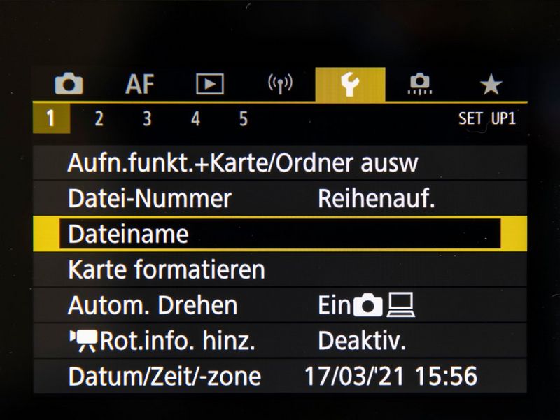 Profi-Digitalkameras vom Typ EOS verwenden einen aus vier Zeichen bestehenden Kameracode, der dem Dateinamen vorangestellt ist. Dieser Code wird einmalig für eine bestimmte Kamera vergeben und wird von Canon werkseitig voreingestellt. Bei den neueren Kameras – der EOS 5D Mark IV, der EOS-1 D Serie und der EOS R5 – kann der Code vom Fotografen individuell festgelegt und nach Wunsch beliebig oft geändert werden. So kann es sein, dass du für ein bestimmtes Shooting einen individuell festgelegten Code verwenden möchtest, etwa „21NY“ für dein Shooting 2021 in New York. Einzelheiten findest du in der Bedienungsanleitung deiner Kamera. Hinweis: Das erste Zeichen darf kein Unterstrich sein, da dieser, wie oben beschrieben, für Fotos mit Nutzung des Adobe RGB reserviert ist.