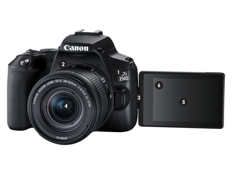 Support anfordern¹ EOS 250D (Black/Silver) is the world's lightest among all the digital single-lens reflex APS-C size sensor cameras with a movable LCD monitor. Including battery and memory card as per CIPA guidelines. As of April 9th, 2019 (researched by Canon).
