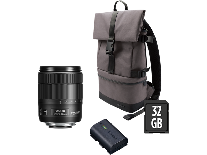 Zum Set gehört das vielseitige EF-S 18-135mm f/3.5-5.6 IS USM Objektiv, mit dem du Weitwinkelansichten aufnehmen und für Porträts heranzoomen kannst, eine 32 GB-Speicherkarte und ein robuster Rucksack sowie ein Ersatzakku, damit noch länger aufnehmen kannst.
