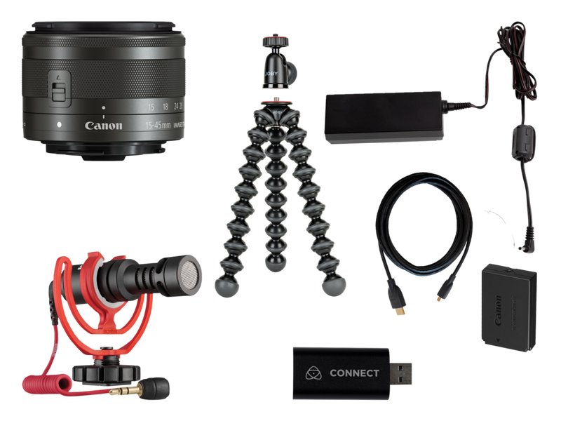 Dieses Kit enthält ein EF-M 15-45mm f/3.5-6.3 IS STM Objektiv mit der perfekten Brennweite zum Live-Streaming, ein JOBY GorillaPod 1K Stativ, um die Kamera stabil zu positionieren, ein externes RODE Mikrofon für hervorragende Audioqualität, einen ATOMOS Connect 4K Adapter, um die Kamera einfach mit dem Computer zu verbinden, ein HDMI-Kabel und einen Canon DR-E12 Gleichstromkuppler mit CA-PS700 Adapter zum Anschluss an das Stromnetz für endloses Live-Streaming.