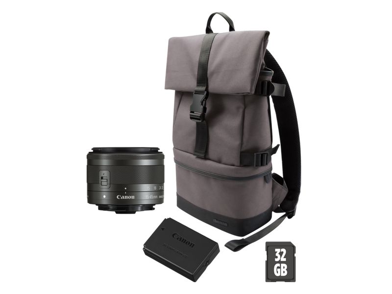 Zum Set gehört das vielseitige EF-M 15-45mm f/3.5-6.3 IS STM Objektiv, mit dem du Weitwinkelansichten, Nahaufnahmen und Porträts aufnehmen kannst, eine 32 GB-Speicherkarte und ein robuster Rucksack sowie ein Ersatzakku, damit noch länger aufnehmen kannst.