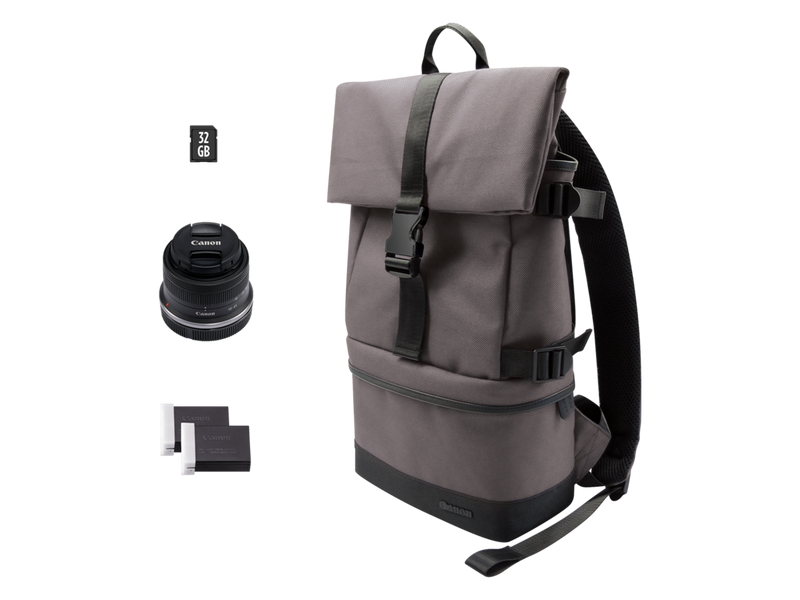 Das kompakte RF-S 18-45mm F4.5-6.3 IS STM ist ideal für Porträts, Reisen, Vlogging und Alltagsszenen. Dieses exklusive Kit enthält außerdem eine 32-GB-Speicherkarte, einen robusten Rucksack und einen Ersatzakku – damit kannst du deine Kreativität ausleben.