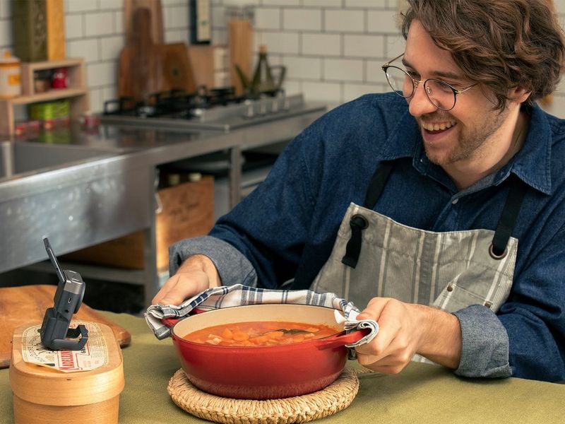 Mit einem eingebauten, einklappbaren Standfuß mit mehreren möglichen Positionen¹ nimmst du freihändig aus der Küche oder unterwegs bei neuen Abenteuern auf.